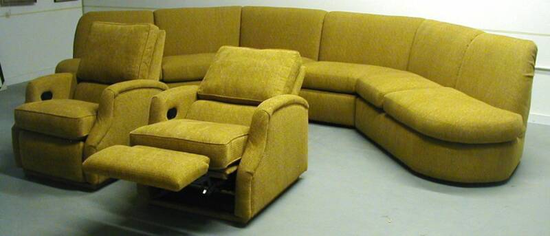Reclining chair with finger tip electric control. This chair will retain any position along the way, from upright to full recline. We will make these units in rows or by themselves in any style suitable to the room. This style unit does not bump the wall.